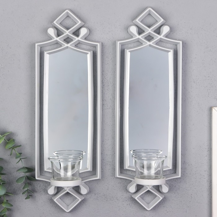Подсвечник пластик, стекло на 1 свечу "Зеркальный свет" набор 2 шт d-4 см белая 8х11,5х37 см 90688