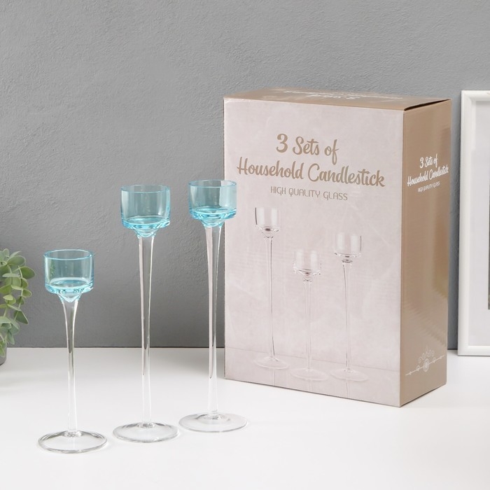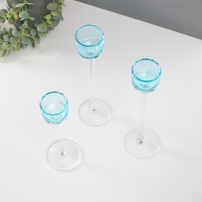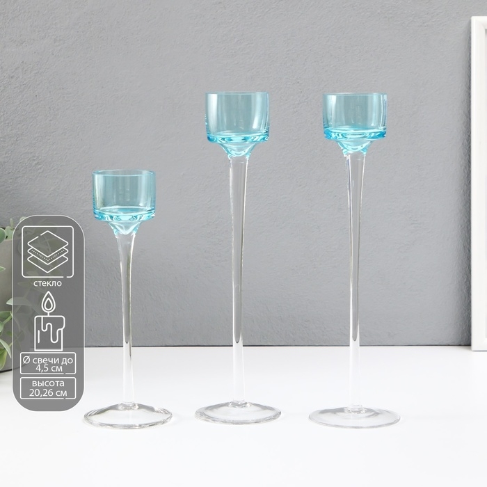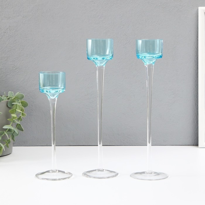 Подсвечник стекло набор 3 шт "Прозрачность мыслей" высота 26см-2шт., 20 см- 1шт. синий