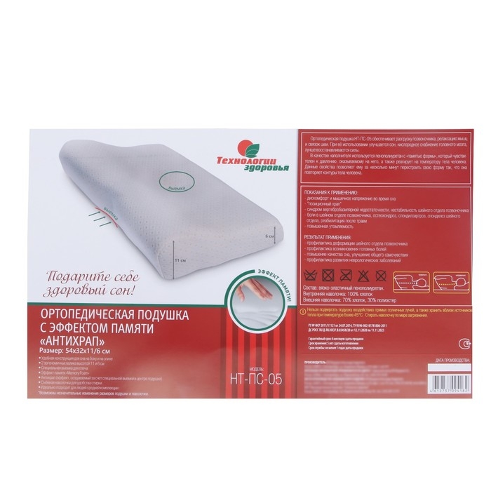 Подушка ортопедическая НТ-ПС-05 "Антихрап", для взрослых, с эффектом памяти и выемкой под плечо, 54x32 см, валики 11/6 см