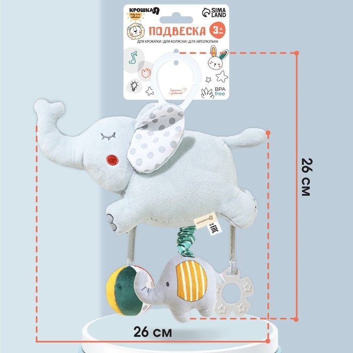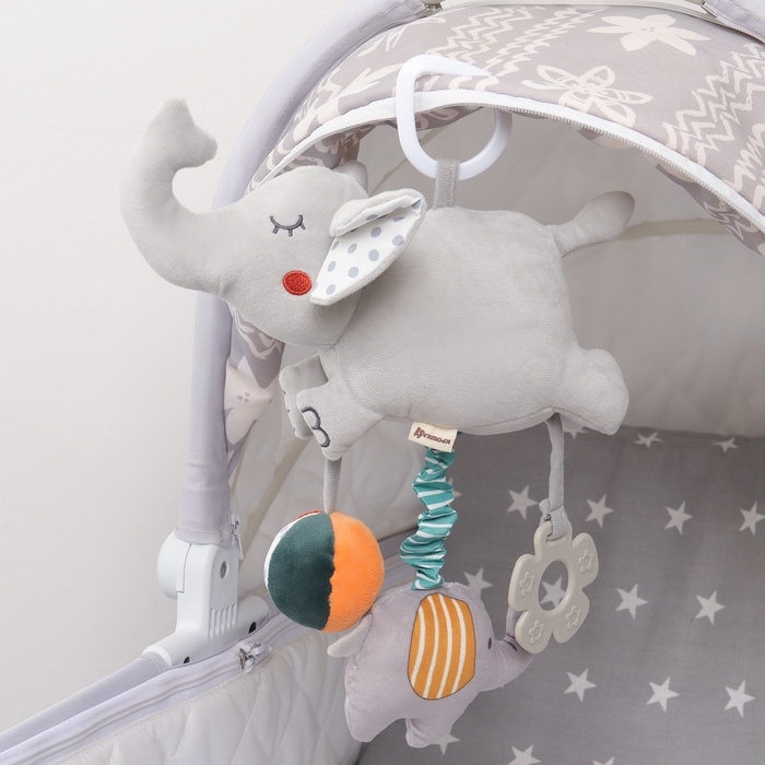 Подвесная игрушка для малышей Слоник привлечет внимание малыша и полностью безопасна.