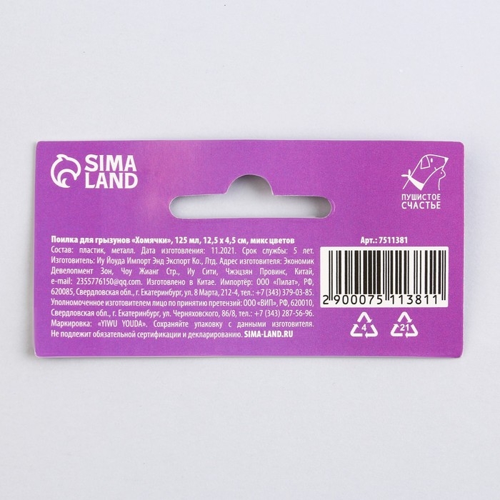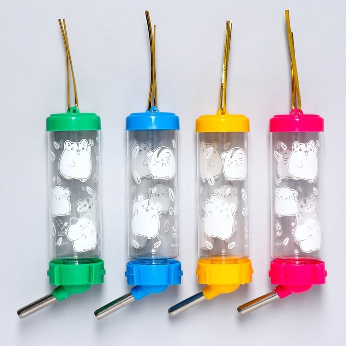 Поилка для грызунов «Хомячки» 125 мл, 12.5х4.5 см, микс цветов