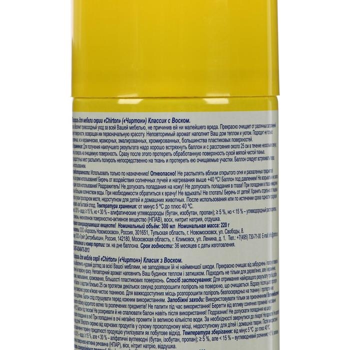 Полироль для мебели Chirton «Антипыль классик», 300 мл превосходно очищает от различных загрязнений и полирует поверхности, возвращая им изначальный вид.
