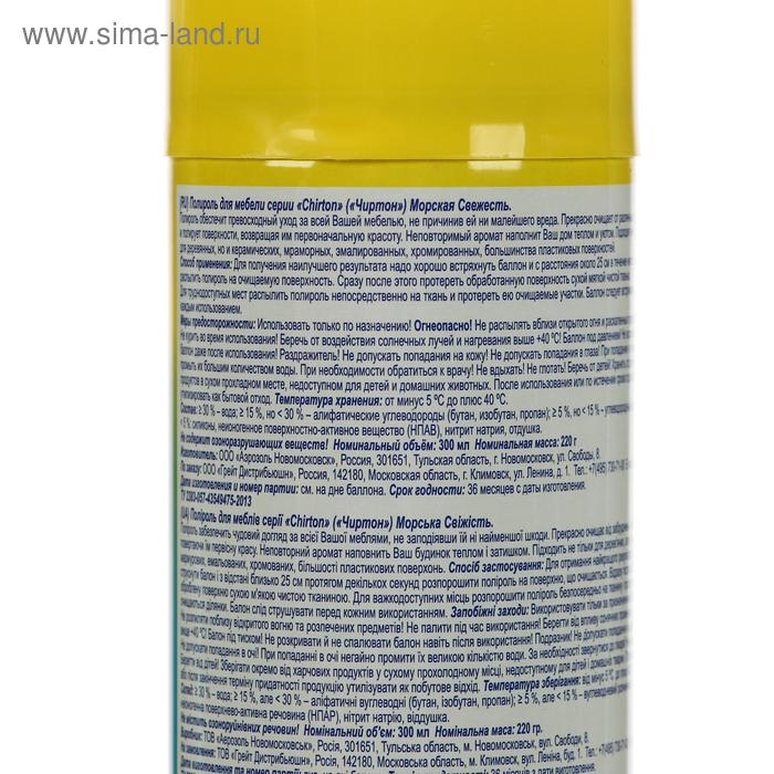 Полироль для мебели Chirton "Антипыль: Морская свежесть", 300 мл превосходно очищает от различных загрязнений и полирует поверхности, возвращая им изначальный вид.