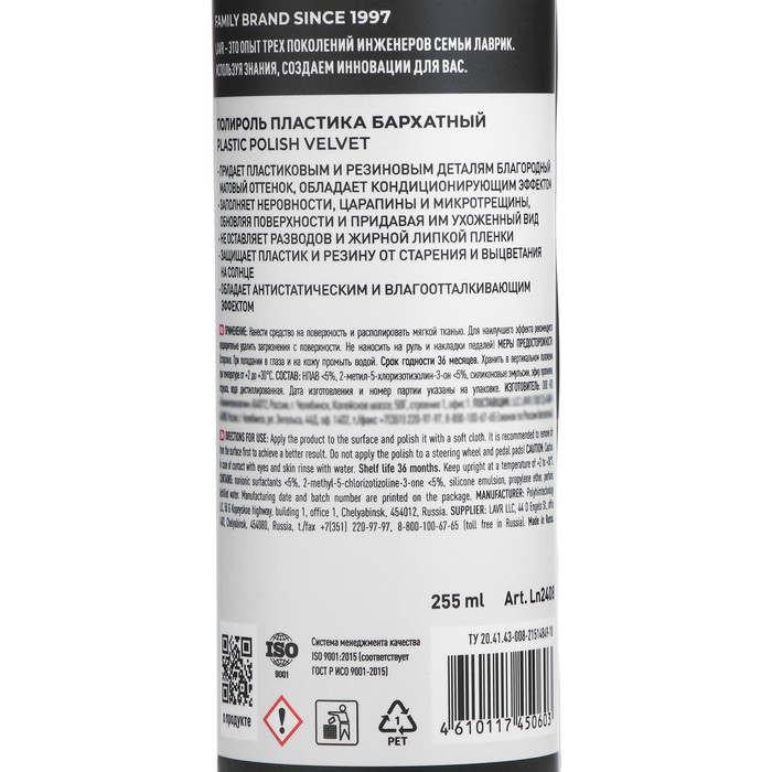 Полироль пластика LAVR бархат, 255 мл, триггер Ln2408