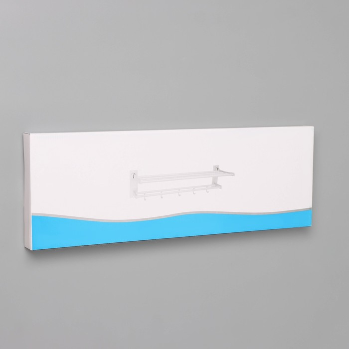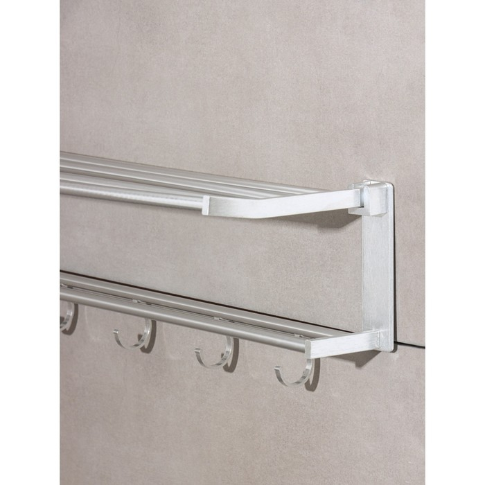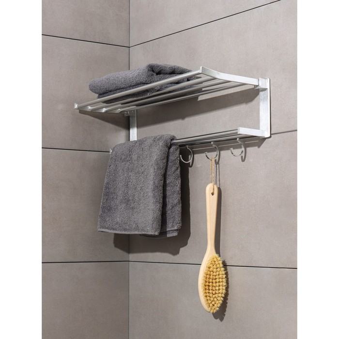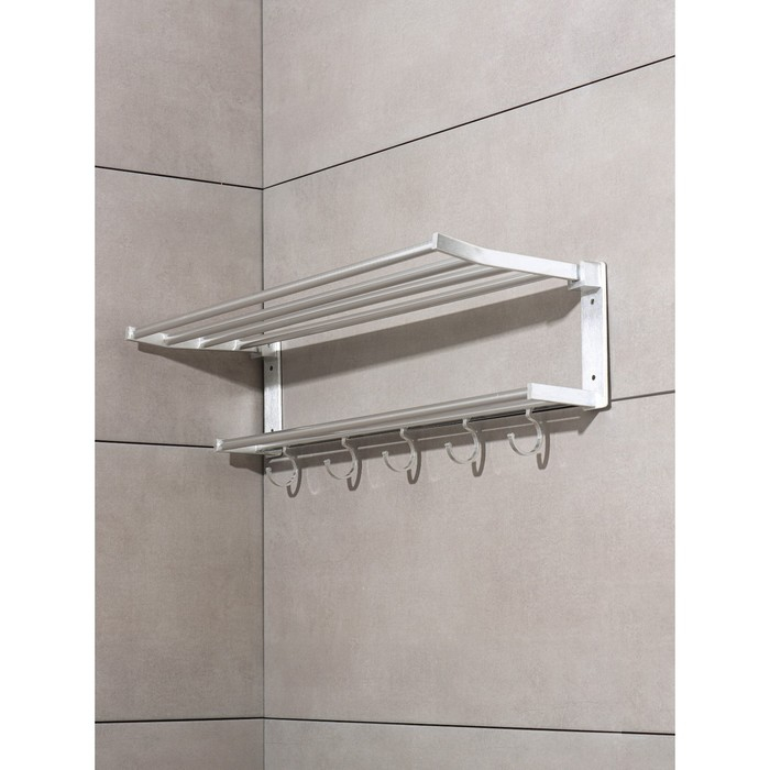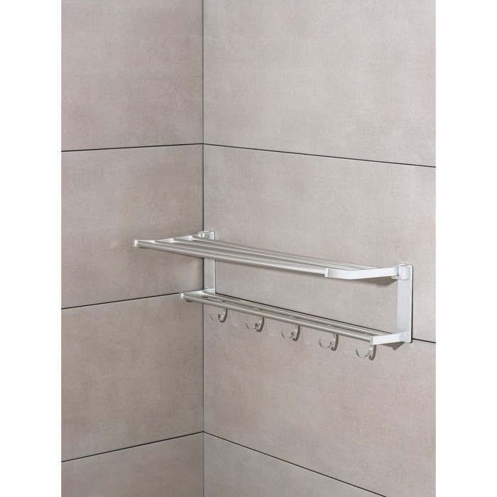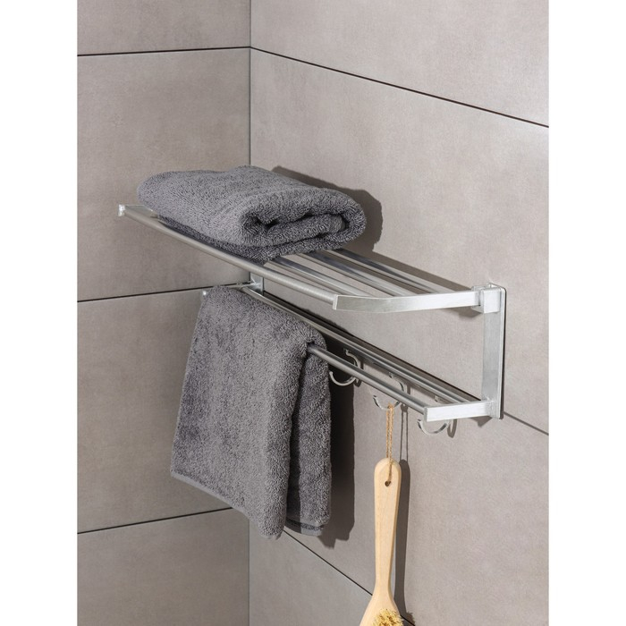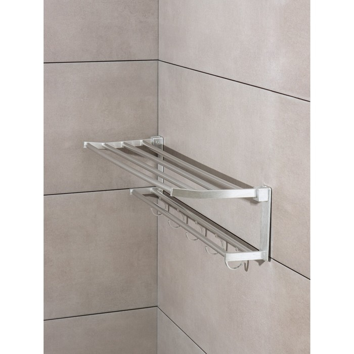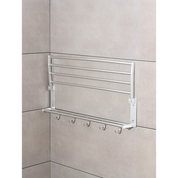 Полка откидная с держателем полотенец, 5 двигающихся крючков, 59,5×20,5×15 см, алюминий