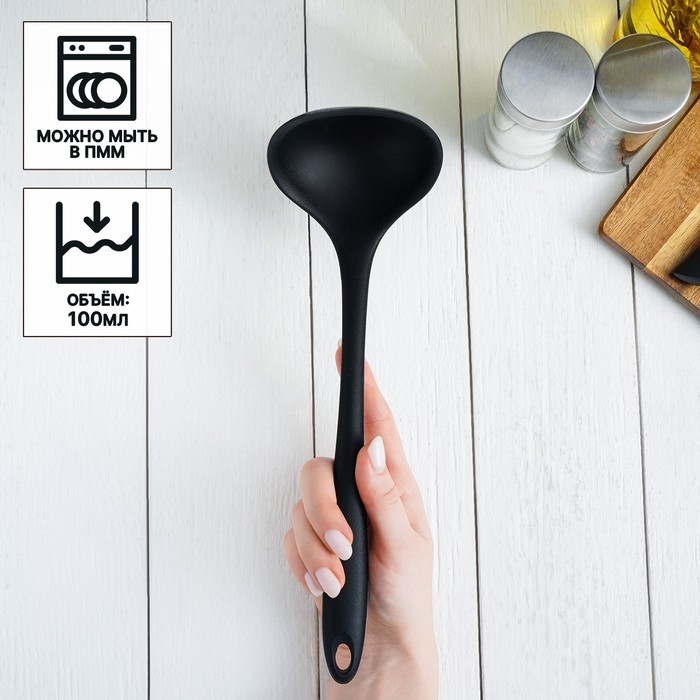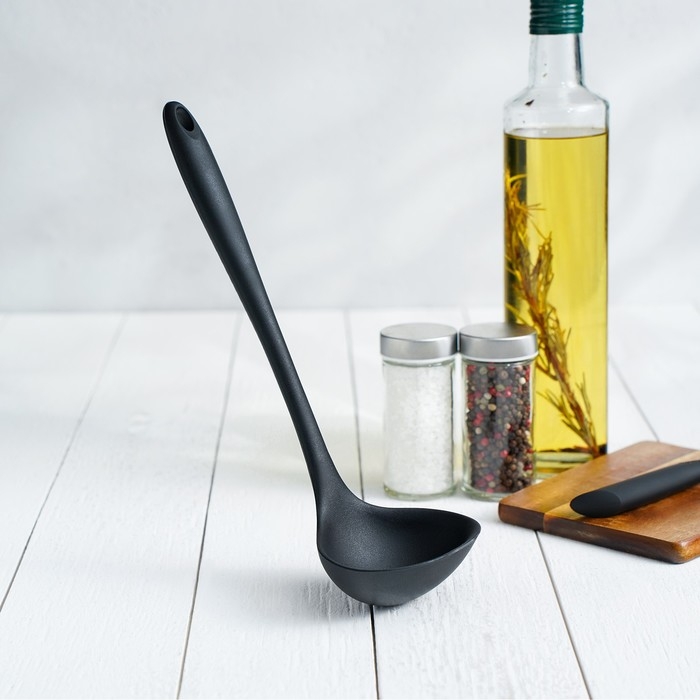 - Форма половника подойдёт для супа, каши, бульона, компота и прочих жидких блюд, а длинная ручка позволяет доставать продукты из самых глубоких кастрюль и других емкостей.