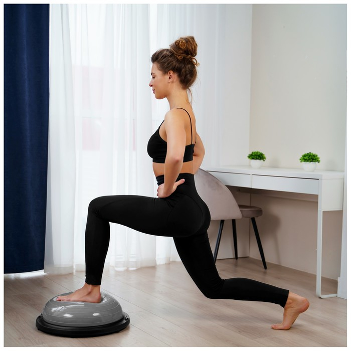 - Выпады с удерживанием носка на полусфере. Опорная нога на полу, колено под прямым углом к полу, руки перед грудью. Вторая нога размещена на полусфере. Приседать нужно медленно, удерживая равновесие.