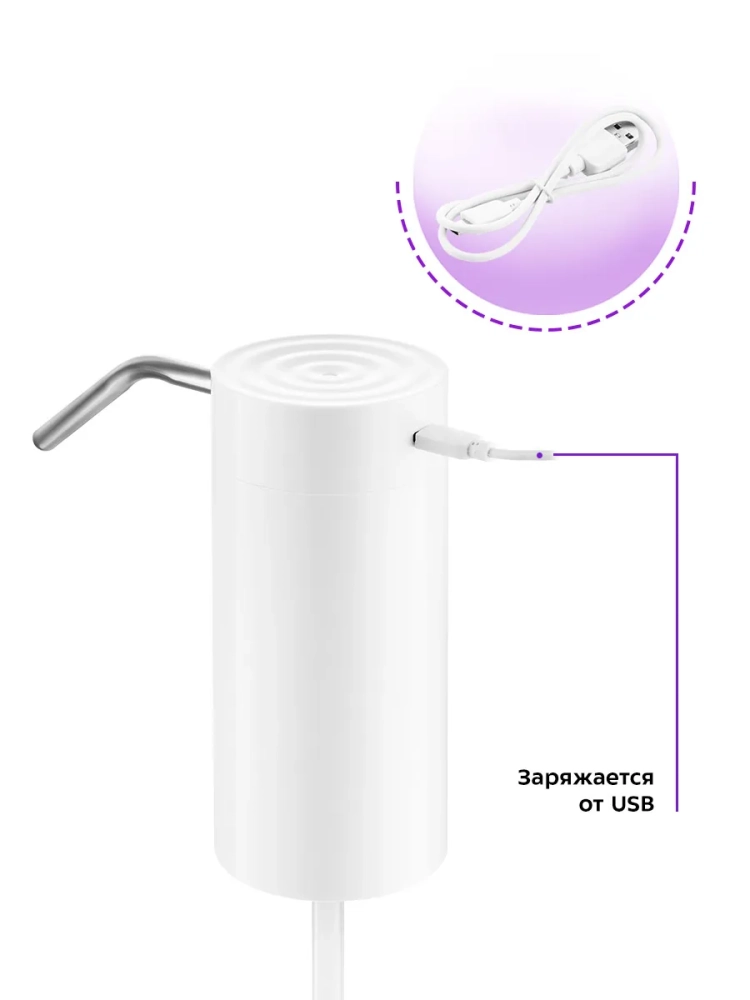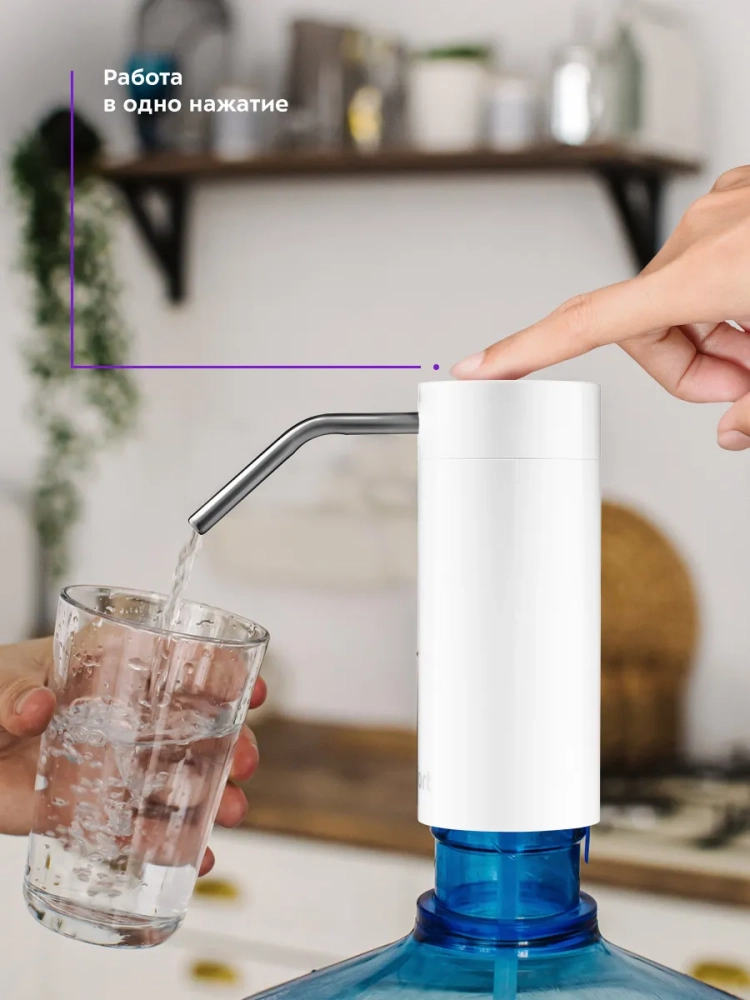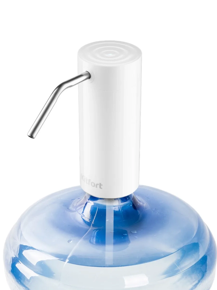 Электрическая помпа для воды Kitfort КТ-2059 очень проста в использовании, включается нажатием на сенсорную кнопку, работает от встроенного аккумулятора емкостью 2000 мА\*ч, и одного заряда хватает на прокачку до 150 литров воды. Помпа полностью автономная и является достойной заменой кулера. Модель Китфорт КТ-2059 универсальная в использовании, ее можно установить на бутыли емкостью 5, 10, 17 и 19 литров. Помпа изготовлена из безопасных материалов, корпус из пластика, всасывающий шланг из пищевого силикона, а трубка, из которой подается вода, из нержавеющей стали. Принцип действия механических помп основан на создании внутри резервуара избыточного давления воздуха, из-за чего вода вытесняется по трубке наружу. Для такого вида помп очень важно, чтобы корпус устройства плотно прилегал к горлышку бутылки. В отличие от механических помп, модель КТ-2059 не требует таких условий, что сильно расширяет способы применения. Например, вы можете опустить силиконовый шланг в кастрюлю или любую другую нестандартную емкость.