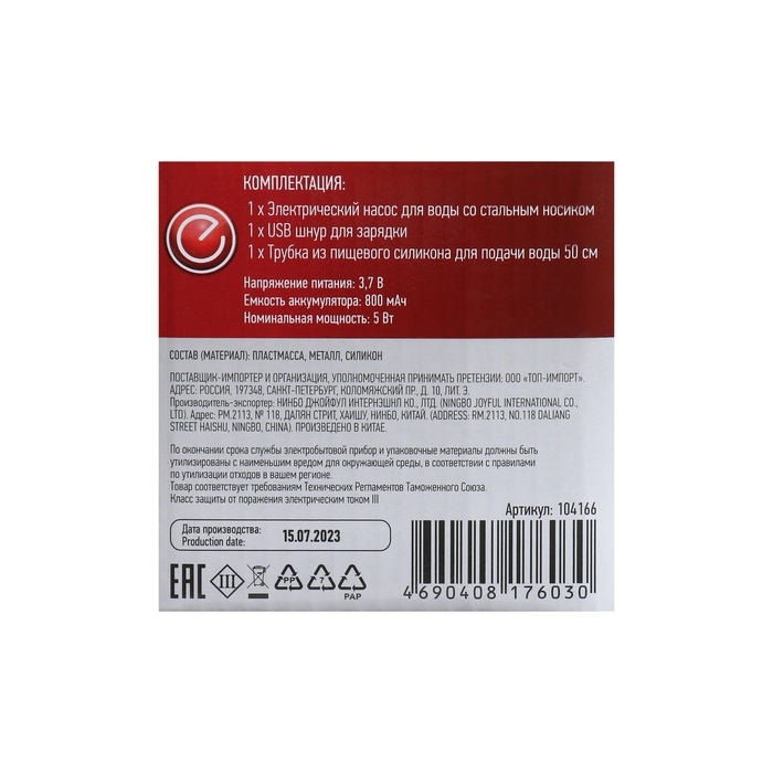 Помпа для воды ENERGY EN-009E, электрическая, 5 Вт, 800 мАч, от USB, чёрная