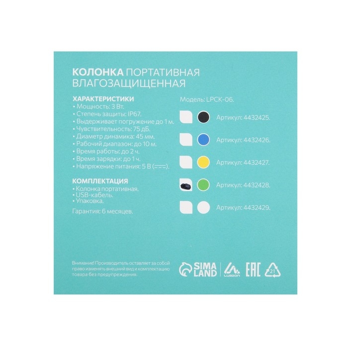 Портативная колонка LuazON LPCK-06, 150 мАч, водостойкая, на присоске, зеленая