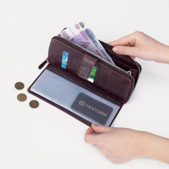 Портмоне мужское на молнии TEXTURA, для купюр, для карт, для монет, цвет коричневый