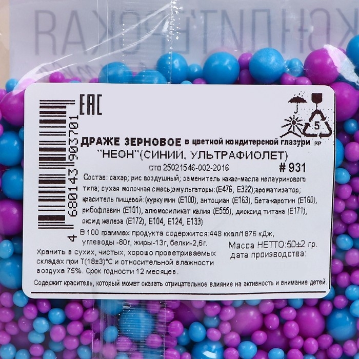 Посыпка кондитерская с эффектом неона в цветной глазури "Синий, ультрафиолет", 50 г