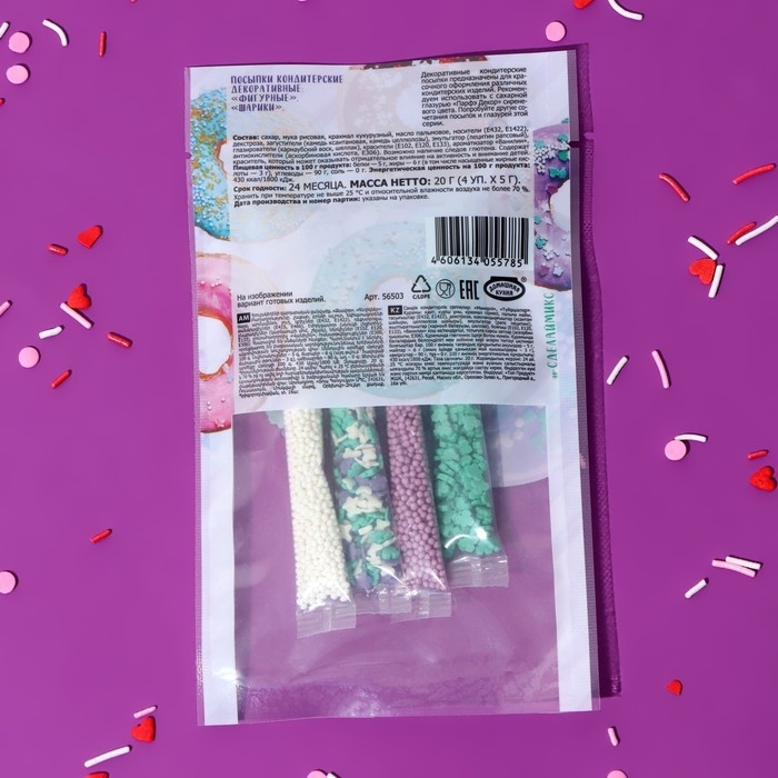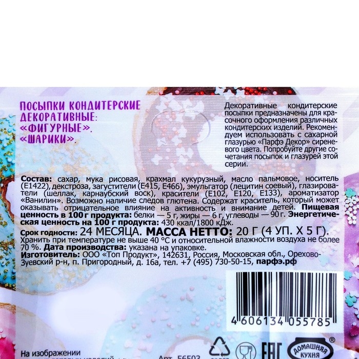 Область применения: декоративные кондитерские посыпки наносят на поверхность готовых изделий (тортов, пирожных, кексов, рулетов, мороженого, шоколадной глазури, сахарной помадки, сдобы и бубликов и других) для придания им красивого внешнего вида.