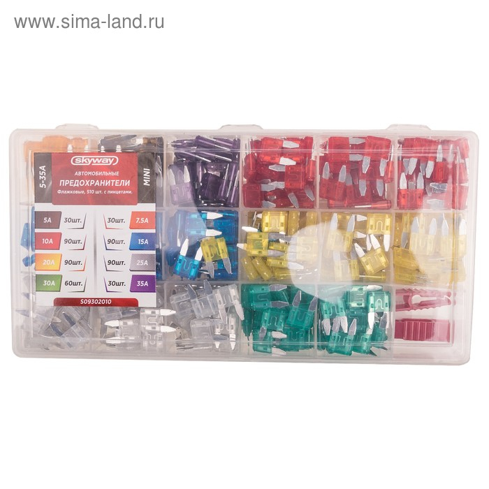 Предохранитель флажковый Skyway, "мини", 5-35А, в пластиковой коробке, набор 510шт , S09302010