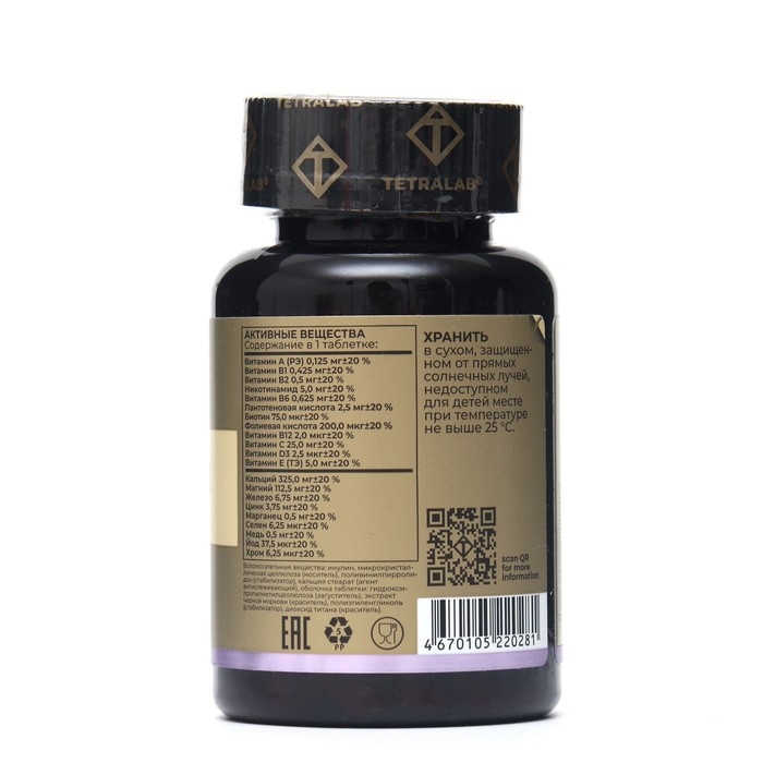 Состав: кальция карбонат, магния карбонат, инулин, микрокристаллическая целлюлоза (носитель), калия аспарагинат, поливинилпирролидон (стабилизатор), аскорбиновая кислота (витамин С), железа фумарат, кальция стеарат (агент антислеживающий), DL-альфа-токоферолa ацетат (витамин Е), цинка цитрат, никотинамид (витамин В3 (РР)), марганца глюконат, селенометионин, D-пантотенат кальция (витамин В5), инозит (витамин В8), холина битартрат (витамин В4), меди цитрат, холекальциферол (витамин D3), ретинола ацетат (витамин А), пиридоксина гидрохлорид (витамин В6), тиамина гидрохлорид (витамин В1), рибофлавин (витамин В2), фолиевая кислота (витамин В9), цианокобаламин (витамин В12), биотин (витамин В7), калия йодид, хрома пиколинат, оболочка таблетки: гидроксипропилметилцеллюлоза (загуститель), экстракт черной моркови (краситель), полиэтиленгликоль (стабилизатор), диоксид титана (краситель).