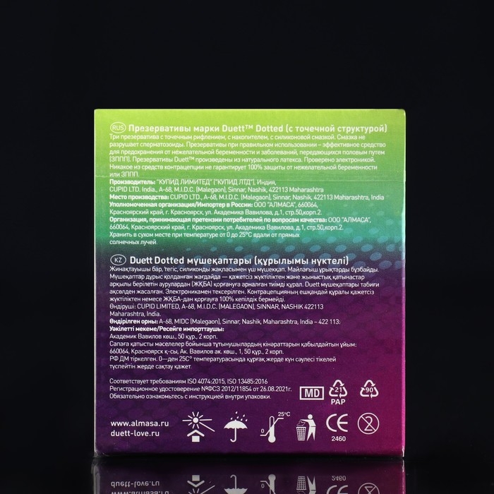 Описание: ""Duett Dotted"" с точечным рифлением, с накопителем, гладкие, с силиконовой смазкой. Смазка не разрушает сперматозоиды. Презервативы при правильном использовании – эффективное средство для предохранения от нежелательной беременности и заболеваний, передающихся половым путем (ЗППП). Презервативы Duett™ произведены из натурального латекса. Проверено электроникой. Никакое из средств контрацепции не гарантирует 100% защиты от нежелательной беременности или ЗППП.