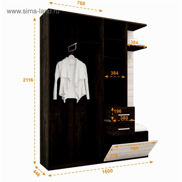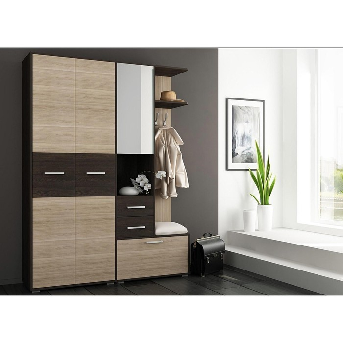 Прихожая Танго 2 – вместительная и функциональная. Просторный шкаф оснащен выдвижной штангой и широкой полкой. За дверцей с зеркалом находятся полочки. В нижней нише для хранения можно хранить обувь, в двух выдвижных ящиках под зеркалом поместится вся важная мелочь. Также в прихожую Танго 2 входят прочные крючки для верхней одежды и полка для головных уборов. Мягкого сиденья нет в комплекте.