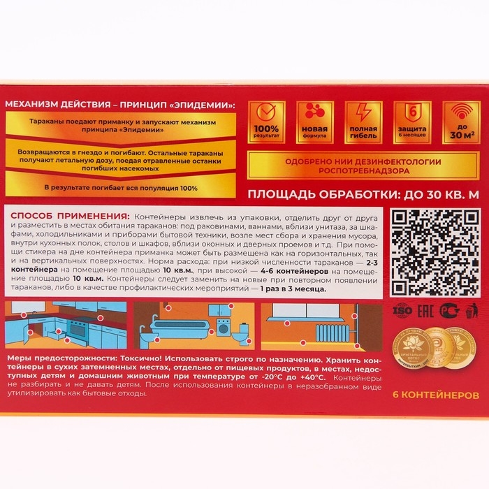 ОписаниеАбсолют инсектицидное средство в виде заключенной в диски приманки с привлекательными для целевых насекомых тараканов и муравьев аттрактантами. Отзывы потребителей о дисках Абсолют подтверждают их высокую эффективность. Отравленные тараканы приводят в действие принцип эпидемии. Передают частички геля, оставшиеся на покровах тела насекомых, сородичам при контакте, что приводит их к гибели. Погибшие насекомые поедаются сородичами, которые при этом получают достаточную для отравления дозу препарата и погибают. Абсолют приманка в контейнерах рекомендуется к применению в помещениях с невысокой численностью насекомых, а также в качестве профилактических мероприятий при наличии риска заселения тараканами (тараканы у соседей).Составдиазинон 0,5%Способ примененияКонтейнеры извлечь из упаковки, отделить друг от друга и разместить в местах обитания тараканов: под раковинами, ваннами, вблизи унитаза, за шкафами, холодильниками и приборами бытовой техники, возле мест сбора и хранения мусора, внутри кухонных полок, столов и шкафов, вблизи оконных и дверных проемов и т.д. При помощи стикера на дне контейнера приманка может быть размещена как на горизонтальных, так и на вертикальных поверхностях. Норма расхода: при низкой численности тараканов- 2-3 контейнера на помещение площадью 10 кв.м., при высокой - 4-6 контейнеров на помещение площадью 10 кв.м. Контейнеры следует заменить на новые при повторном появлении тараканов, либо в качестве профилактических мероприятий - 1 раз в 3 месяца.