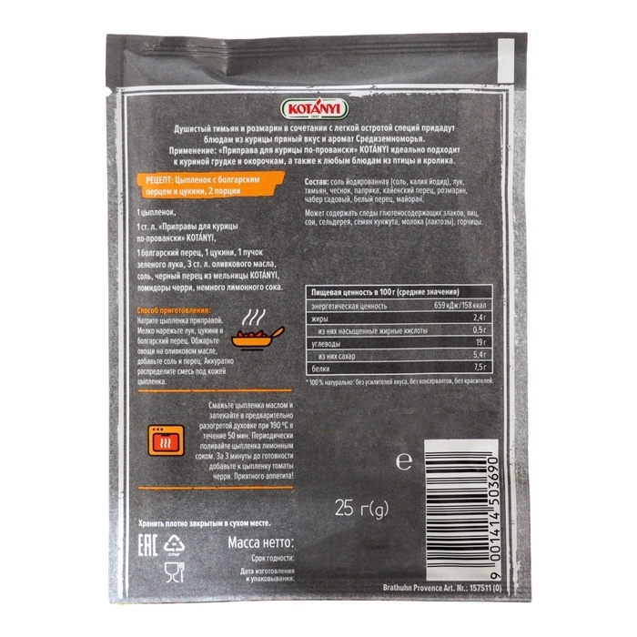 Приправа для курицы по-провански KOTANYI поможет придать кулинарным блюдам из птицы более яркий выразительный вкус и насыщенный аромат. В ее состав входит йодированная соль, лук, тимьян, чеснок, паприка, кайенский перец, розмарин и другие ароматные травы и специи.