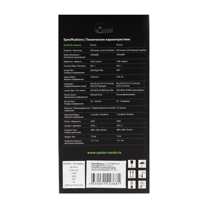 Проектор Cactus CS-PRE.09B.WVGA LCD,1200лм,1024х600,350:1, ресурс лампы:30000часов,USB,HDMI