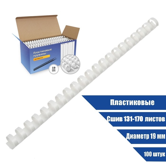 Пружины для переплета пластиковые, d=19мм, 100 штук, сшивают 131-170 листов, белые, Гелеос