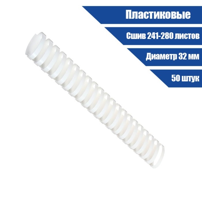 Пружины для переплета пластиковые, d=32мм, 50 штук, сшивают 241-280 листов, белые, Гелеос
