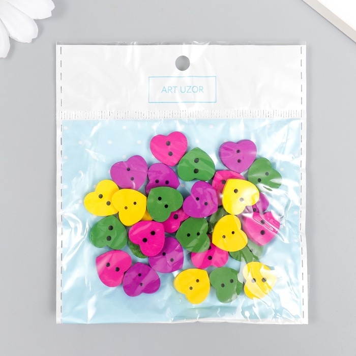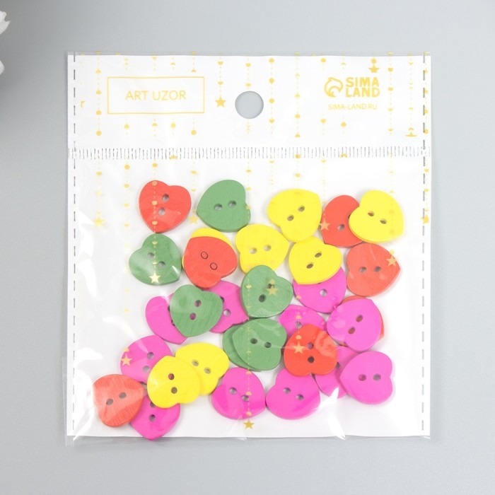 Пуговицы дерево для творчества 2 прокола "Сердечки" набор 30 шт МИКС 1,5х1,5 см