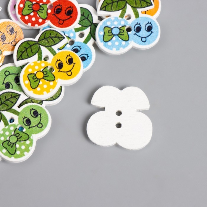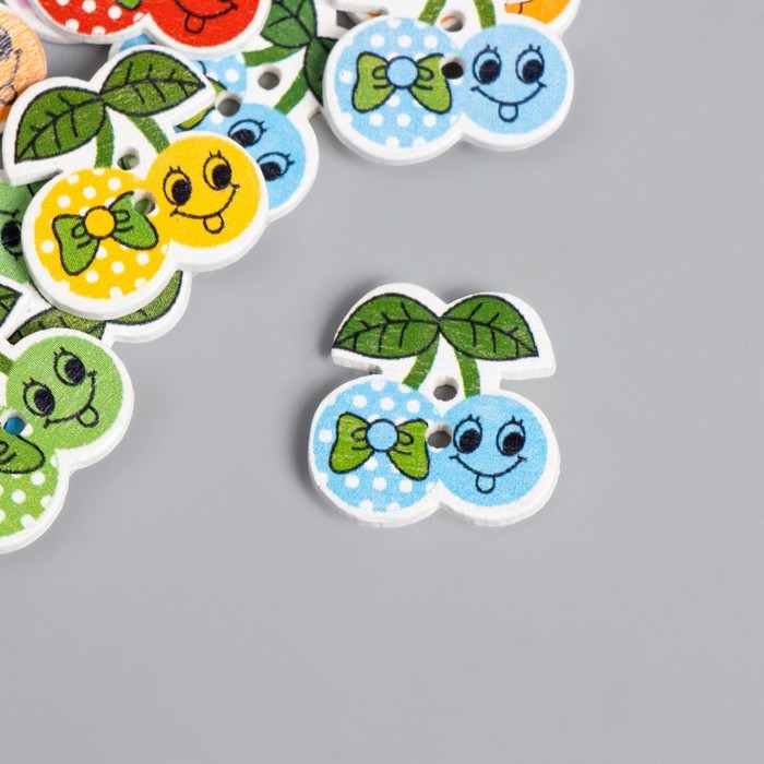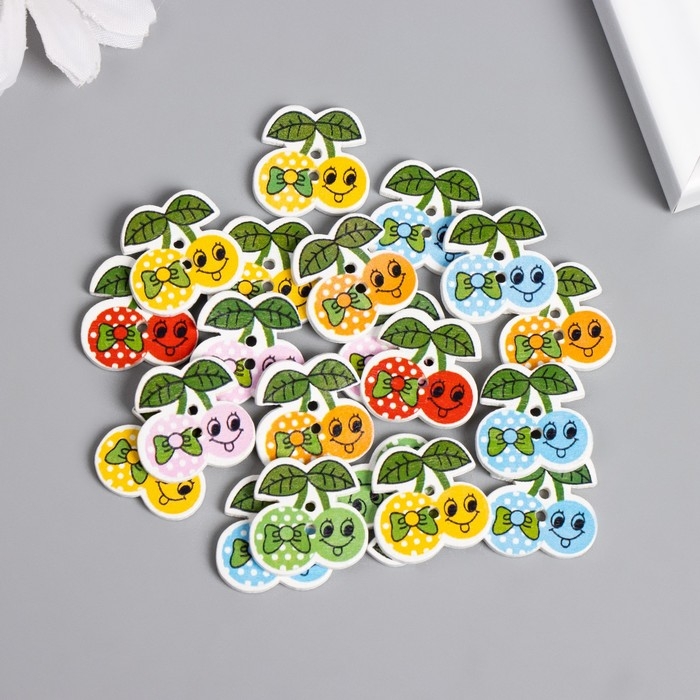 Пуговицы дерево для творчества 2 прокола "Вишенки с бантиком" набор 20шт 1,9х1,9х0,2 см МИКС