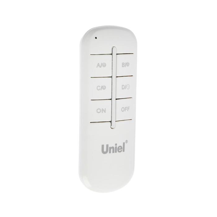 Пульт дистанционного управления светом Uniel совместим со всеми бытовыми системами освещения, выполненными на базе любых ламп. В комплект входит контроллер-приемник радиосигналов, непосредственно пульт дистанционного управления, удобный держатель ПДУ и инструкция. Питание пульта осуществляется от батарейки А23 12V.