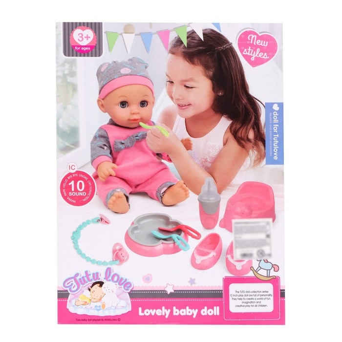 - В комплект входит соска, бутылочка, горшок, туфельки, тарелочка и 3 ложечки. С этими аксессуарами ребёнок придумает множество захватывающих сюжетов и весёлых игр.