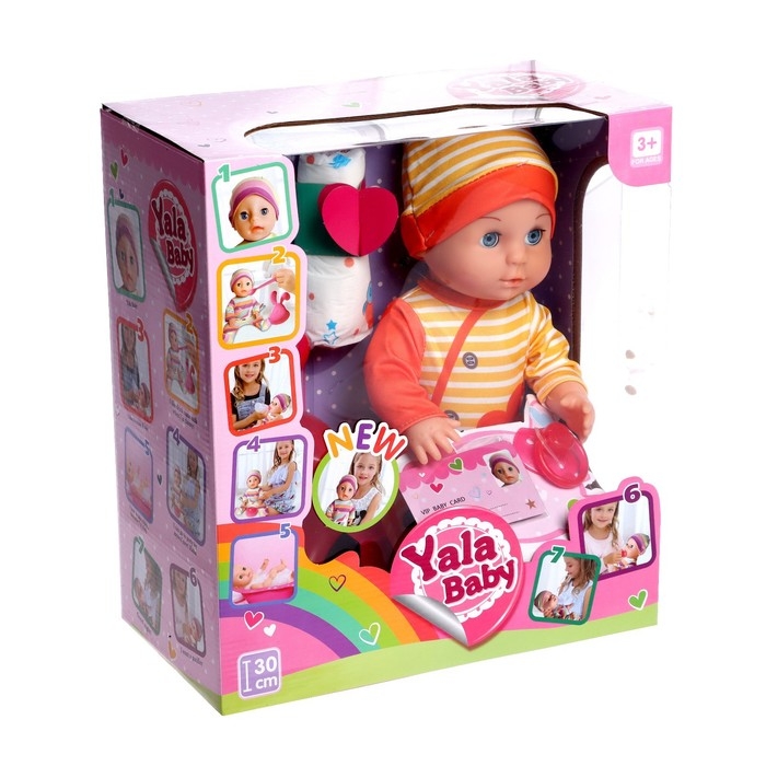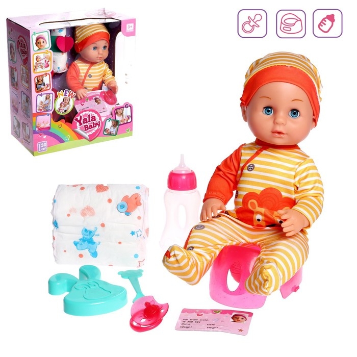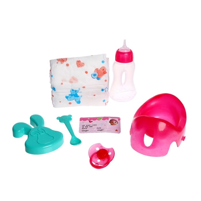 - Пьёт, писает напрямую (кнопки нет), есть горшок, подгузник, соска и бутылочка для кормления куколки.