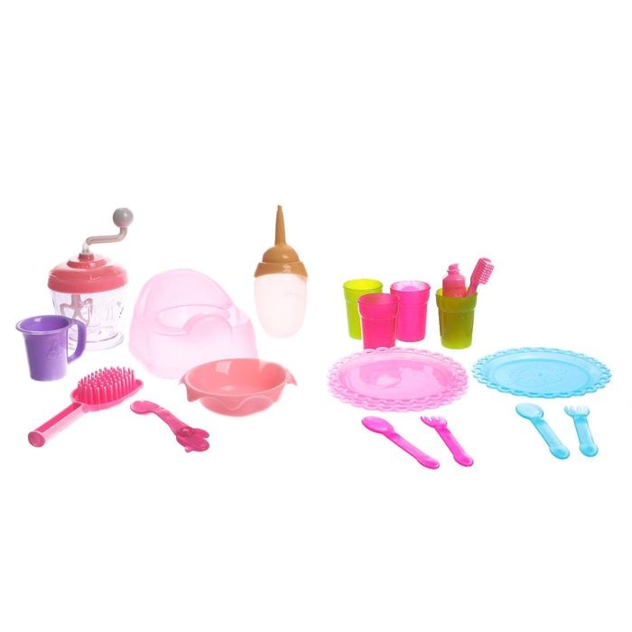 В наборе представлены аксессуары: горшок, посуда для кормления, расчёска, зубная щётка и паста для малыша. Все предметы и куклы выполнены из пластика — безопасного материала для ребёнка.