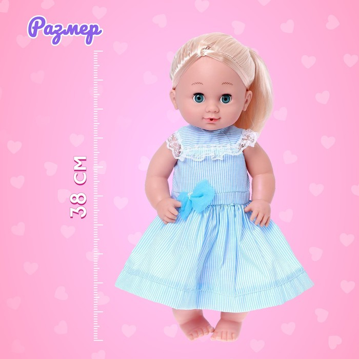 В наборе есть аксессуары для игры: посуда для кормления, горшок, памперс, расчёска. У куклы длинные волосы. Расчешите её локоны и сделайте красивую причёску! Высота пупса — 40,5 см.