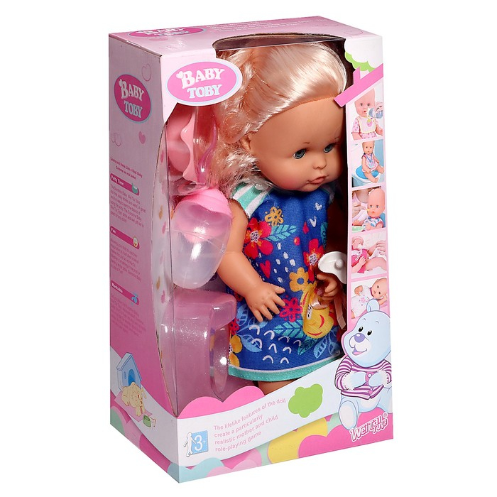 Кукла пьёт из бутылочки, закрывает глаза, писает напрямую (кнопки нет). Ребёнок покормит пупса, посадит его на горшок, искупает в ванной и поменяет ему подгузник. А ещё расчешет волосы и заплетёт косичку.