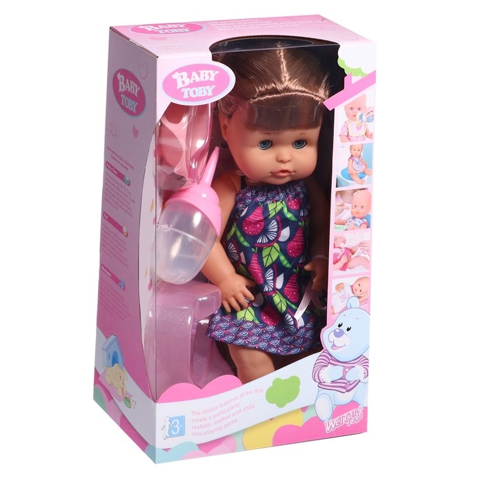Кукла пьёт из бутылочки, закрывает глаза, писает напрямую (кнопки нет). Ребёнок покормит пупса, посадит его на горшок, искупает в ванной и поменяет ему подгузник. А ещё расчешет волосы и заплетёт косичку.