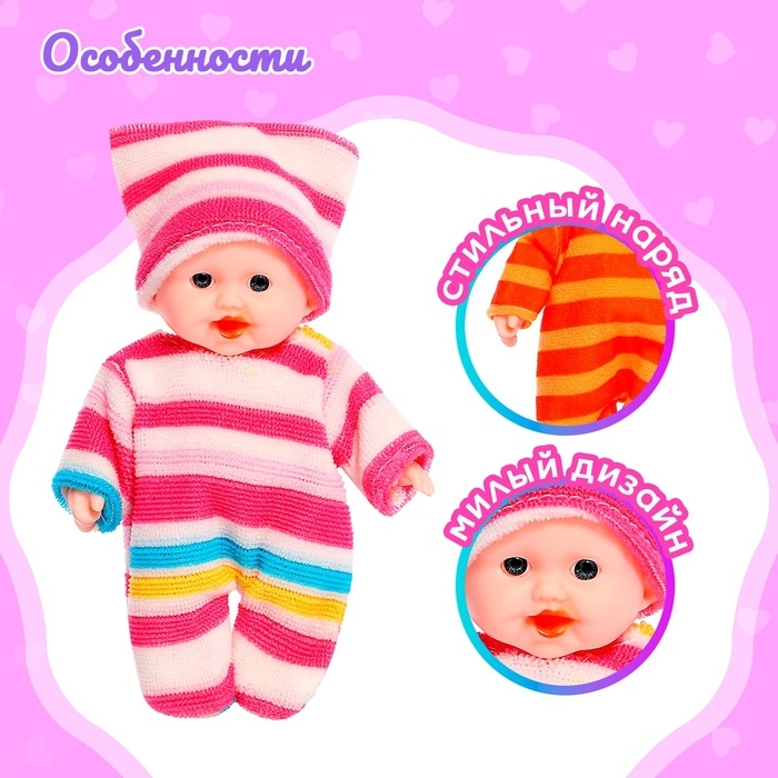 Пупс высотой 12 см изготовлен из безопасного пластика и текстиля, что делает его приятным на ощупь и надежным в использовании. У куклы подвижные руки и ноги, что позволяет ребенку разыгрывать различные сцены и разрабатывать мелкую моторику. Яркий и милый дизайн дополнен стильным нарядом, который можно снимать и менять. Это добавляет игровых возможностей для ребенка и стимулирует развитие воображения.