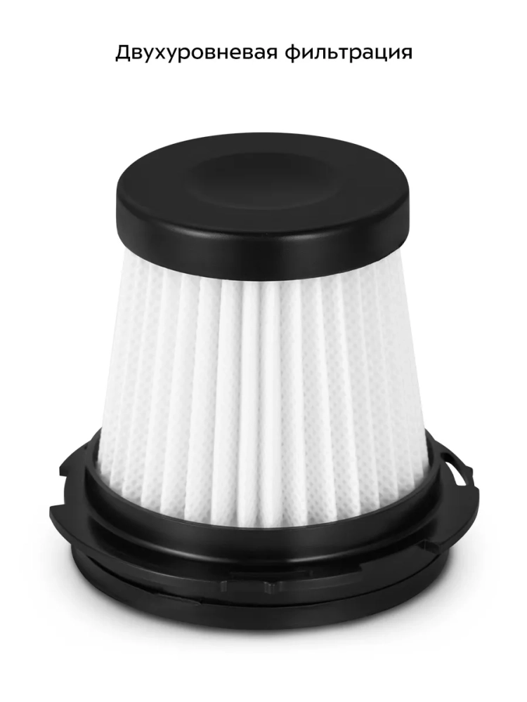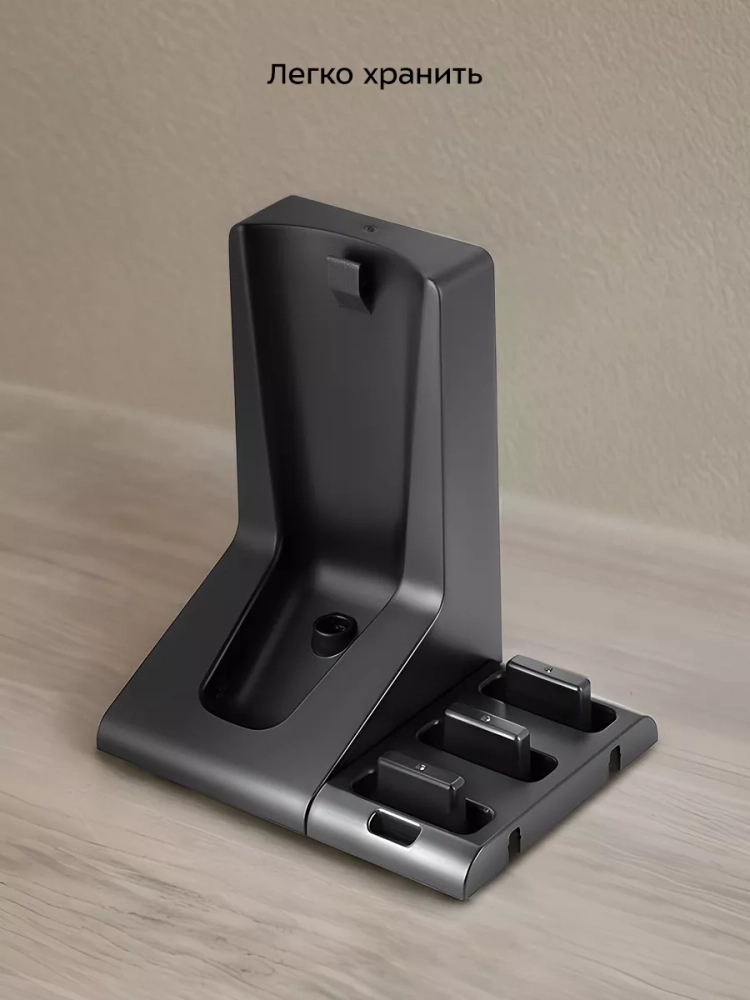 Ручной пылесос оборудован двухуровневой системой фильтрации. В комплекте предусмотрена база для зарядки и хранения устройства, которую можно повесить на стену или поставить на любую ровную горизонтальную поверхность. Для хранения насадок есть специальная подставка, которая прикрепляется к базе.