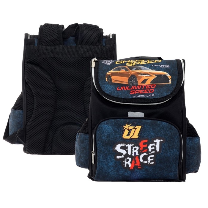 Ранец школьный Стандарт, 34 х 27 х 20 см, Attomex Lite Street Race, чёрный, синий