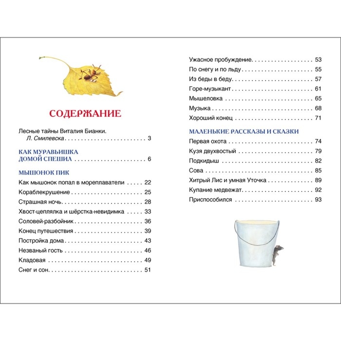 В книгу вошли следующие рассказы В. Бианки «Мышонок Пик», «Как Муравьишка домой спешил», «Первая охота», «Кузя двухвостый», «Подкидыш», «Сова», «Хитрый Лис и умная Уточка», «Купание медвежат», «Приспособился».Художники: Е. Подколзин, Е. Володькина, Н. Лутохина и другие.