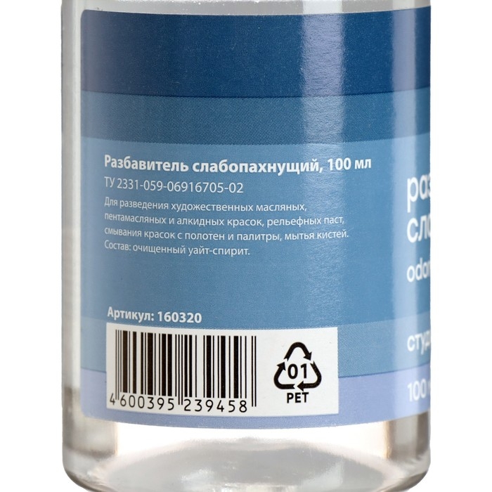Разбавитель слабопахнущий предназначен для разведения и снижения вязкости художественных масляных, пентамасляных и алкидных красок, рельефных паст, смывания красок с полотен и палитры, мытья кистей.