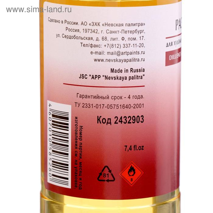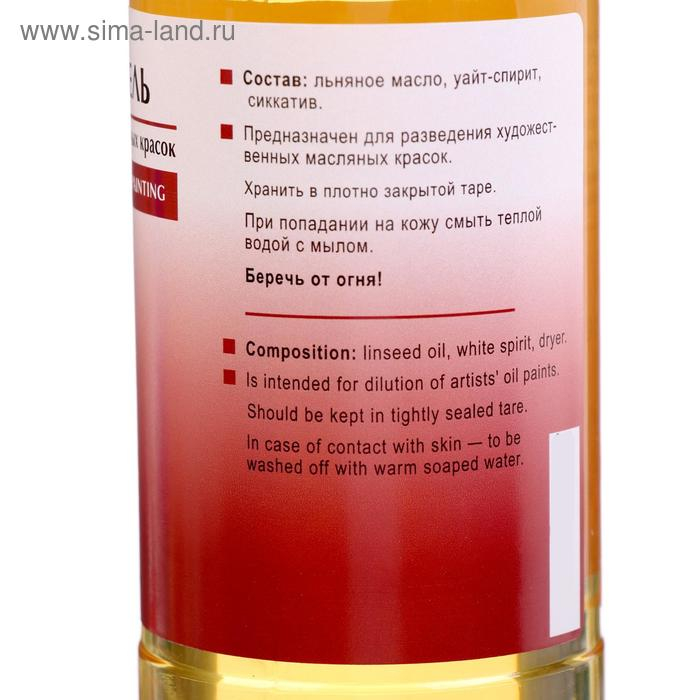 Разбавитель масляный Невская палитра. Применяется для разведение масляных, алкидных красок и для смывания красок с полотен, палитр, кистей. Состав: льняное масло, уайт-спирит, сиккатив.