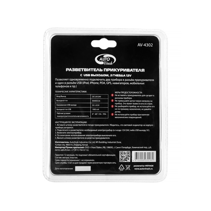 Разветвитель автомобильного прикуривателя Autovirazh с максимальным током 1000 мА предназначен для одновременной зарядки двух устройств и питания одного устройства с USB-портом. Он подходит для автомобилей с напряжением бортовой сети 12 или 24 вольта. Разветвитель имеет компактный размер и выполнен в прочном пластиковом корпусе. Он оснащен тремя разъемами прикуривателя и одним USB-портом для зарядки мобильных устройств. Разветвитель обеспечивает стабильное питание устройств, защищая их от перенапряжения и короткого замыкания.