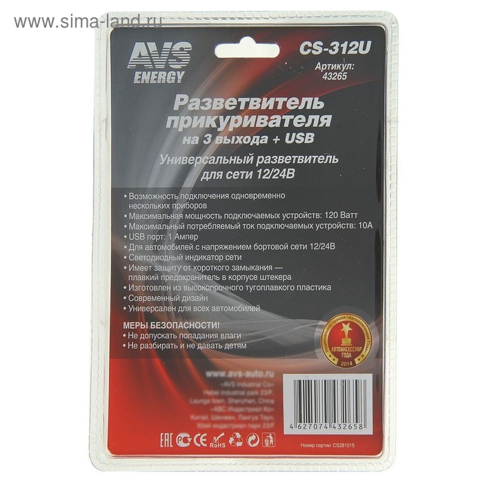 Разветвитель прикуривателя AVS CS312U, 12/24 В, на 3 выхода + USB