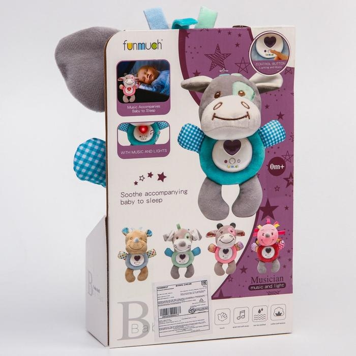 Веселая и полезная игрушка, которая станет хорошим тренажером для развития у ребенка зрения, слуха и тактильных ощущений. Милый пёсик будет радовать кроху днем во время игры своей мягкостью, фактурными деталями и музыкой , а ночью, станет нежным светильником, оберегающим сон крохи.