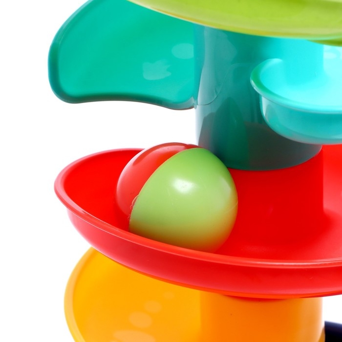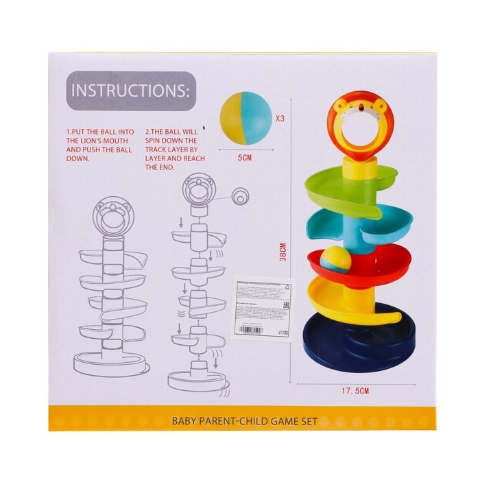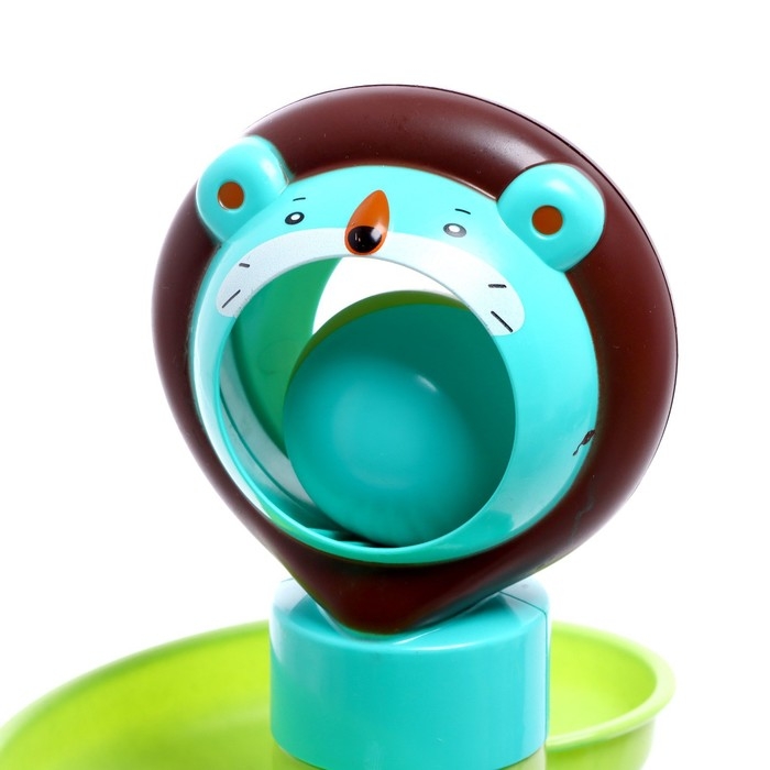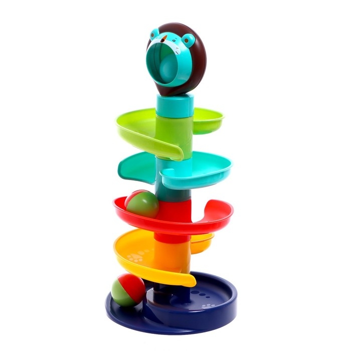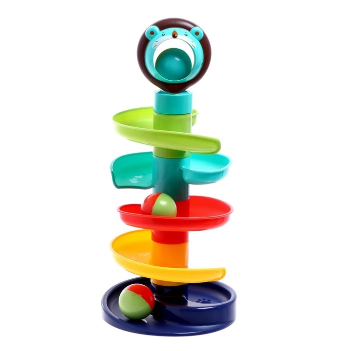 - Собранная пирамидка представляет собой спиралевидную горку, а с её вершины в виде львёнка можно катать шарики-погремушки.