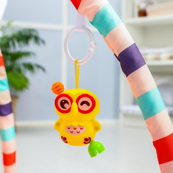 Сначала кроха лёжа на спинке будет просто с интересом разглядывать яркие игрушки на дуге, развивая зрительные навыки и способность фокусировать взгляд на объекте.