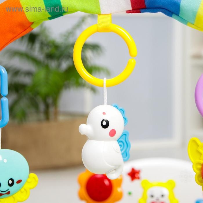 Сначала кроха лёжа на спинке будет просто с интересом разглядывать яркие игрушки на дуге, развивая зрительные навыки и способность фокусировать взгляд на объекте.