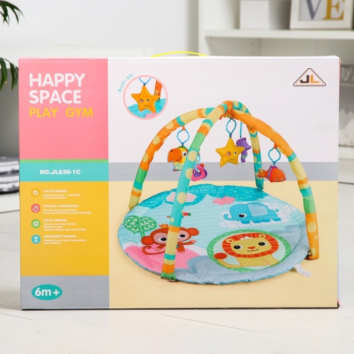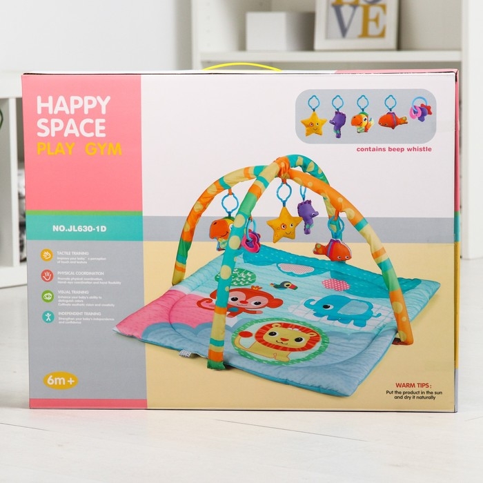 Малыш играет на спинке лёжа. На самом раннем этапе своего развития малыш тянется за яркими, притягивающими внимание игрушками и учится их хватать, так же малыш видит свое отражение в безопасном зеркальце и улыбается. В комплекте с ковриком прилагаются подвесные игрушки, яркие и привлекательные, они служат для развития тактильных ощущений и зрения.