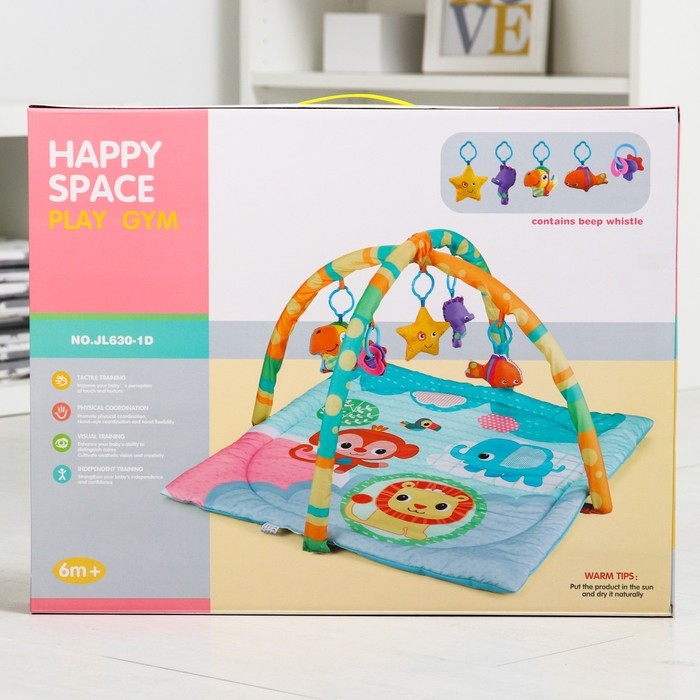 Малыш играет на спинке лёжа. На самом раннем этапе своего развития малыш тянется за яркими, притягивающими внимание игрушками и учится их хватать, так же малыш видит свое отражение в безопасном зеркальце и улыбается. В комплекте с ковриком прилагаются подвесные игрушки, яркие и привлекательные, они служат для развития тактильных ощущений и зрения.