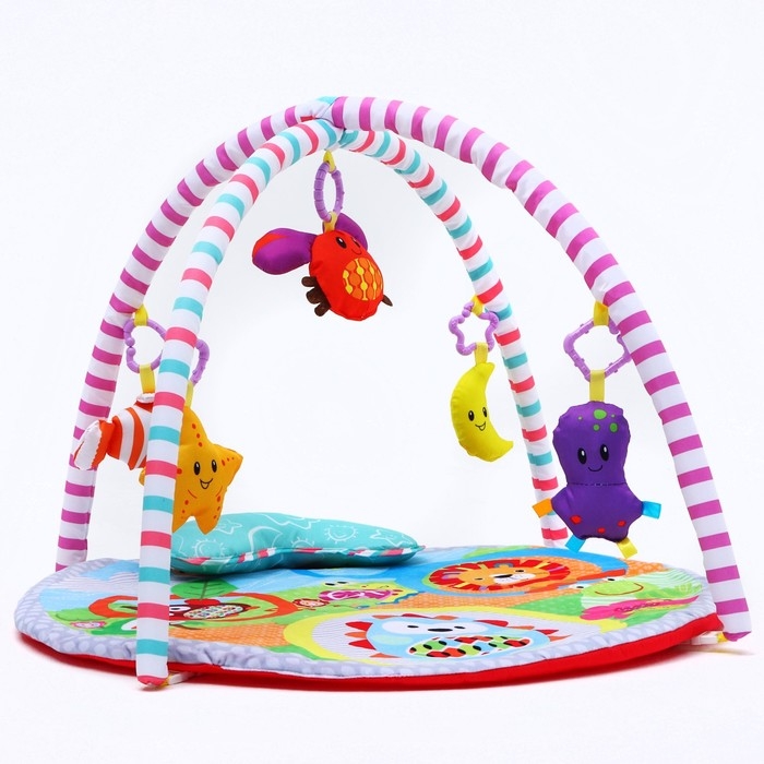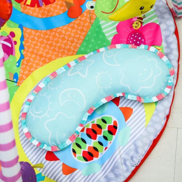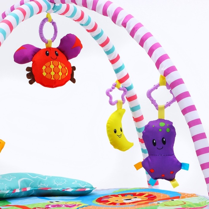 Малыш играет на спинке лёжа. На самом раннем этапе своего развития малыш тянется за яркими, притягивающими внимание игрушками и учится их хватать. В комплекте с ковриком прилагаются подвесные игрушки, яркие и привлекательные, они служат для развития тактильных ощущений и зрения.